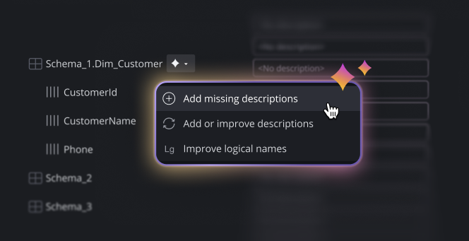 On any database documentation view, you can generate descriptions for tables and columns with a single action. You can ask column-level questions and get answers grounded in the actual project context, not generic explanations. And when you find something worth keeping, the generated insight saves back to the model itself, so the documentation becomes a permanent part of your modeling artifact.