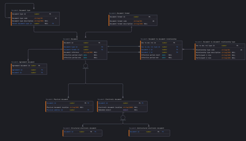 The pattern models documents with type and format classifications, supports document-to-document relationships (versions, translations, supplements, amendments), and cleanly separates physical documents from electronic documents through a subtype hierarchy. Electronic documents are further classified as structured or unstructured. The inclusion of an Agreement Document association demonstrates how documents relate to other business entities—linking contracts to their supporting documentation, for example. This pattern provides the foundation for document management systems, regulatory filing archives, knowledge bases, and any scenario where tracking what was documented, in what format, and how documents relate to one another matters to the business.