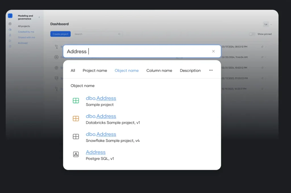 Modern data modeling platforms allow teams to search and discover business entities, definitions, and relationships across projects — helping maintain shared understanding as data platforms scale.