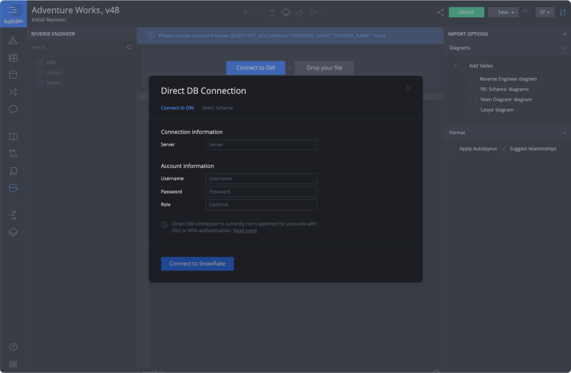Natively connect SqlDBM to web service apps and database providers through secure single sign-on protocols.