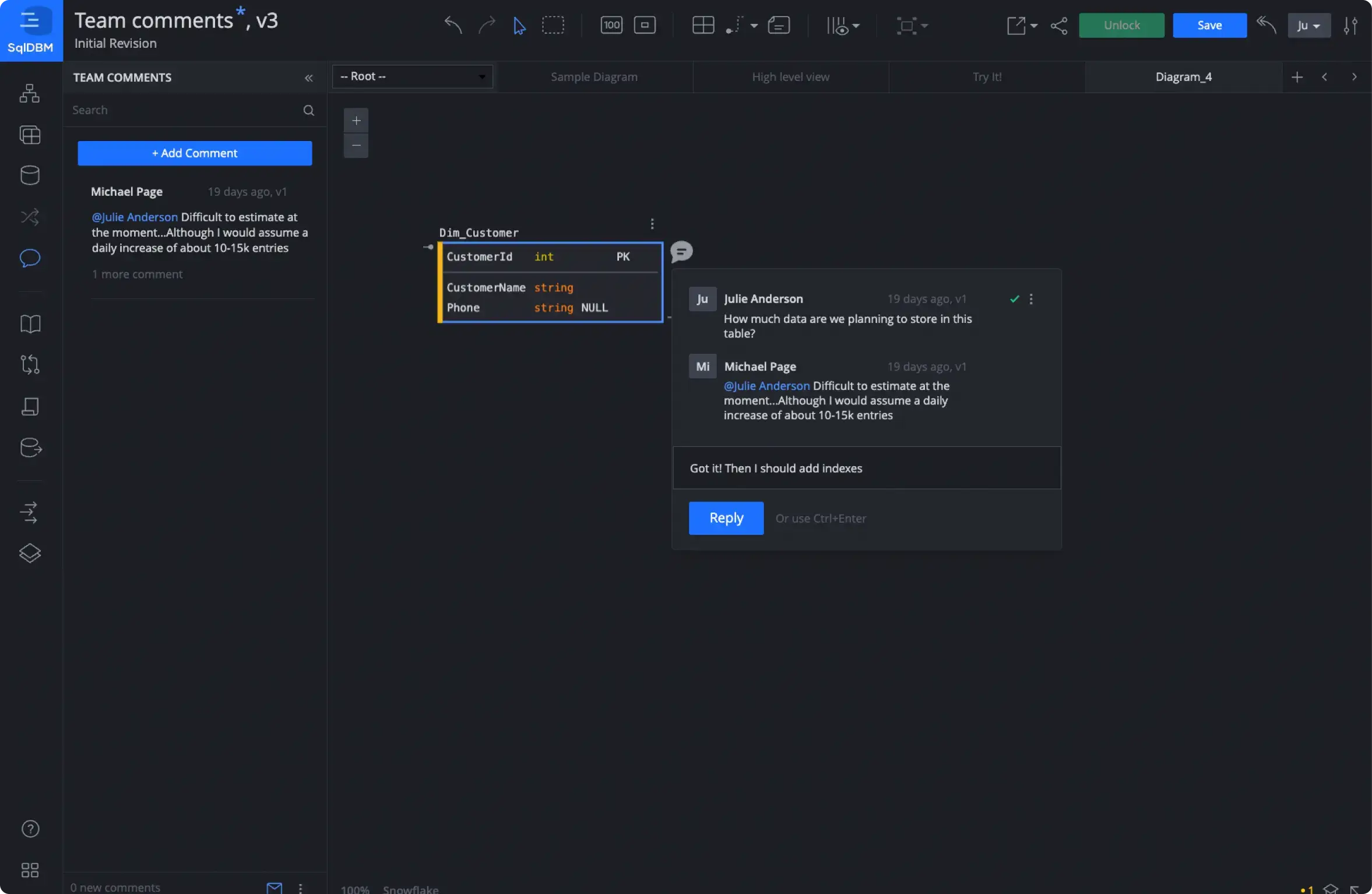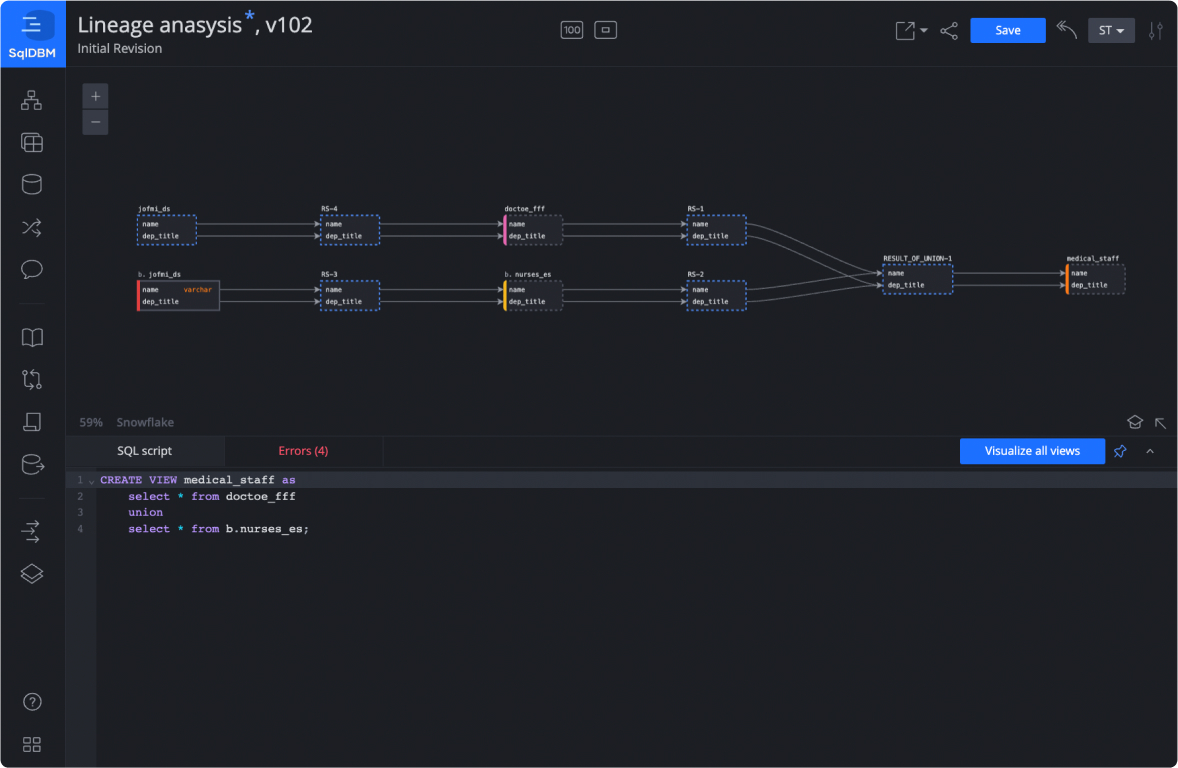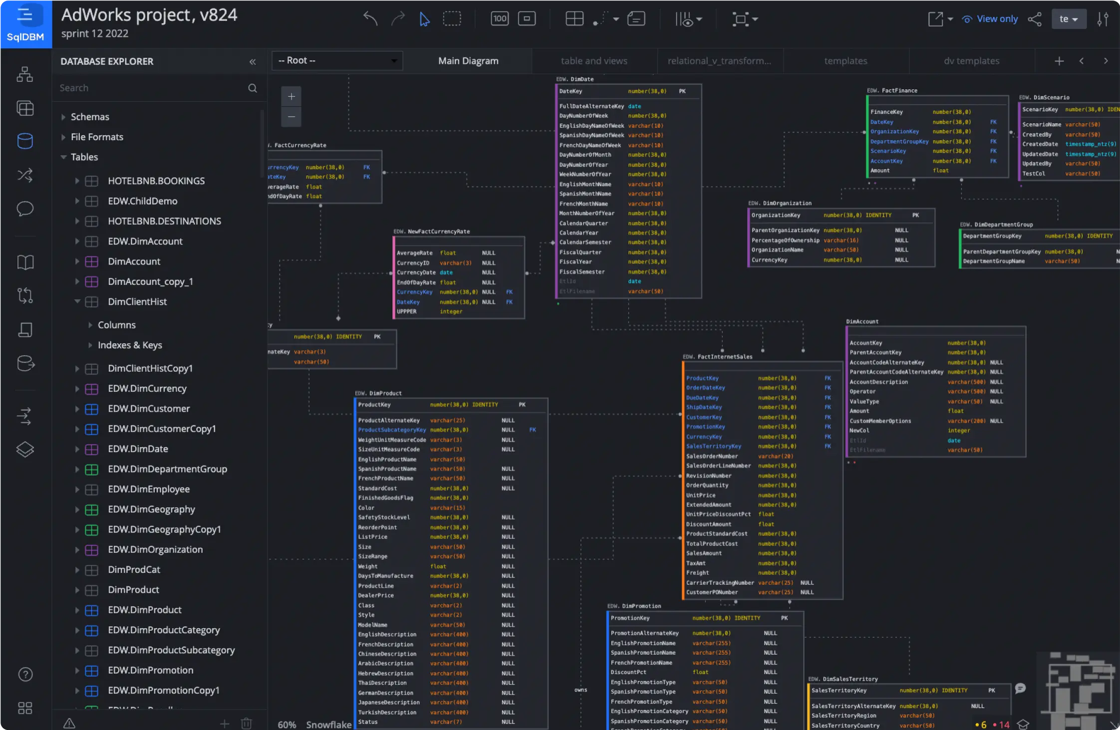 In 2019, SqlDBM became the first online modeling tool to support Snowflake projects and has continued to add support for Snowflake’s latest objects, such as views, functions, and procedures. The ability to natively modify, track, reverse/forward engineer Snowflake objects, and display them on a diagram is why over 300 Snowflake clients use SqlDBM.