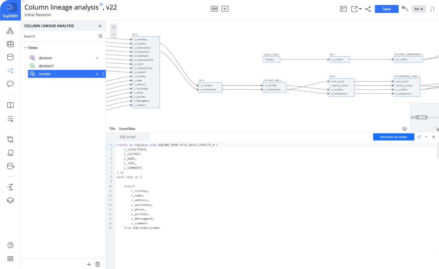 Trace the data flow from source tables to final output (and every step in between) at column level. Column tracing is a breeze with end-to-end highlighting from the diagram or SQL editor.