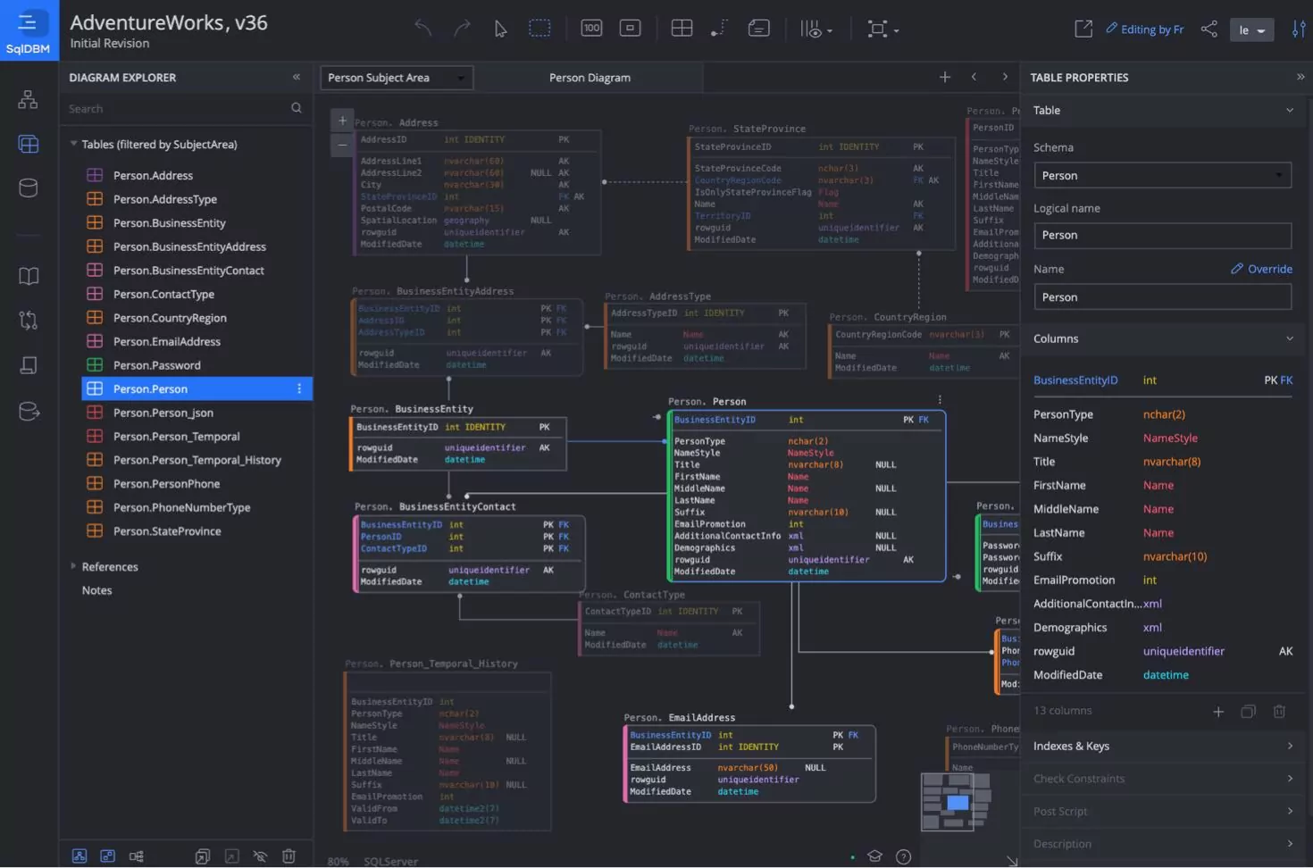 SqlDBM is a cloud based data modeling tool that offers you an easy, convenient way to develop your database absolutely anywhere on any browser. All while incorporating any needed database rules and objects such as database keys, schemas, indexes, column constraints and relationships. Work with the most popular databases and cloud data warehouses.
