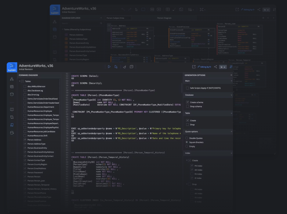 Use SqlDBM to create conceptual, logical and physical ERDs. With SqlDBM you can identify, design, visualize, develop and standardize highly valuable data assets and architecture across business domains in your organization and then with a matter of clicks apply changes to your database without providing any credentials.