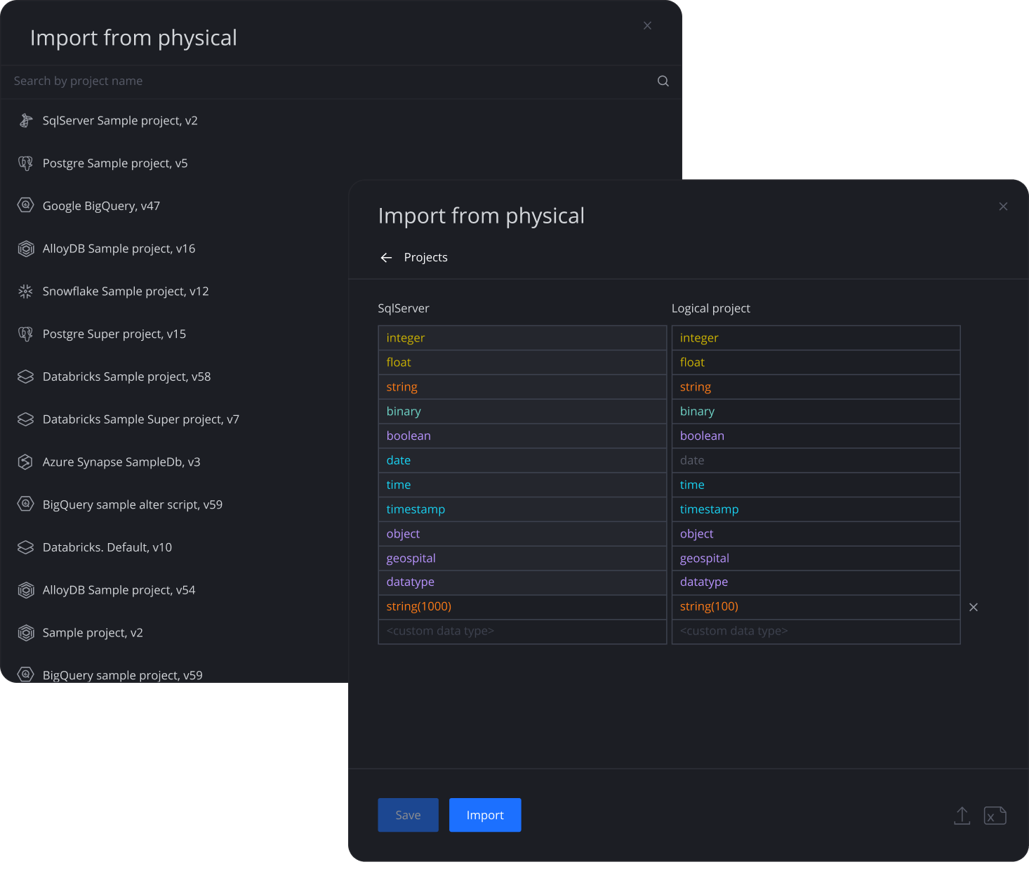 Logical projects can be configured to import or export data models in a flexible and user-configured format. This means users can import from any database type or modeling tool. As these settings can be configured independently for input and output, logical projects can also serve as a bridge when converting between any physical databases.