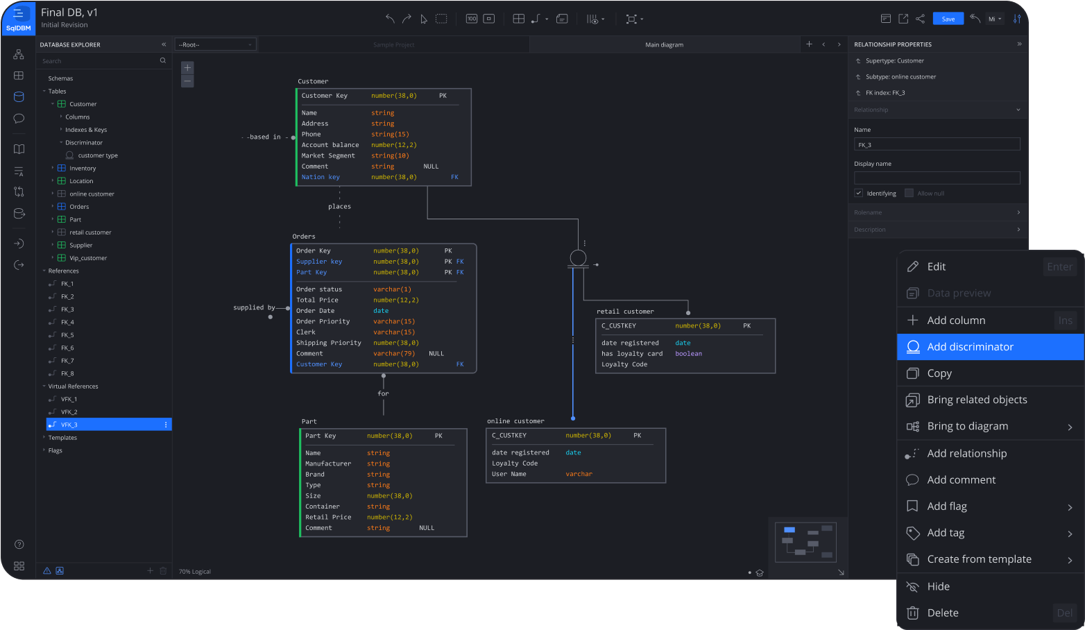 Model and display details that a physical database can not capture, such as subtypes, relationship names, and cardinality. Through simple-to-read conventions, logical projects can go beyond “what is” to “what aught to be” and give your team an accurate understanding of the operational blueprint regardless of the physical databases you’re working with.