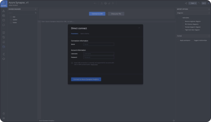 A true cloud solution, SqlDBM offers Direct Connect to Synapse and allows users to reverse engineer entire schemas with just a few clicks. No drivers or desktop clients required.